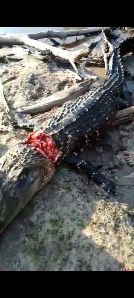 Nas imagens é possível ver o pé do homem identificado como ‘Marcos’, de 27 anos, dilacerado, e o animal já morto pelos populares. Veja as fotos: