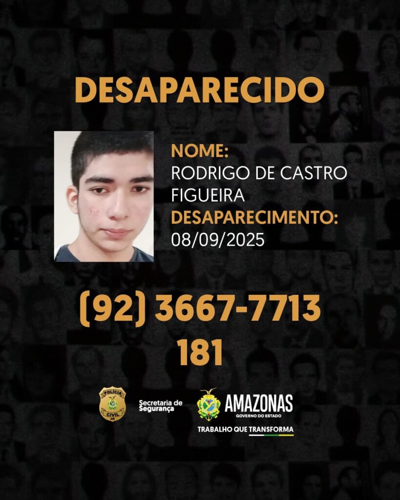 Segundo a Polícia Civil do Amazonas (PC-AM), o jovem foi visto pela última vez por volta das 10h, quando saiu de casa, localizada na alameda Flores, bairro Alvorada, zona Centro-Oeste da capital. Desde então, familiares não tiveram mais notícias sobre o seu paradeiro.