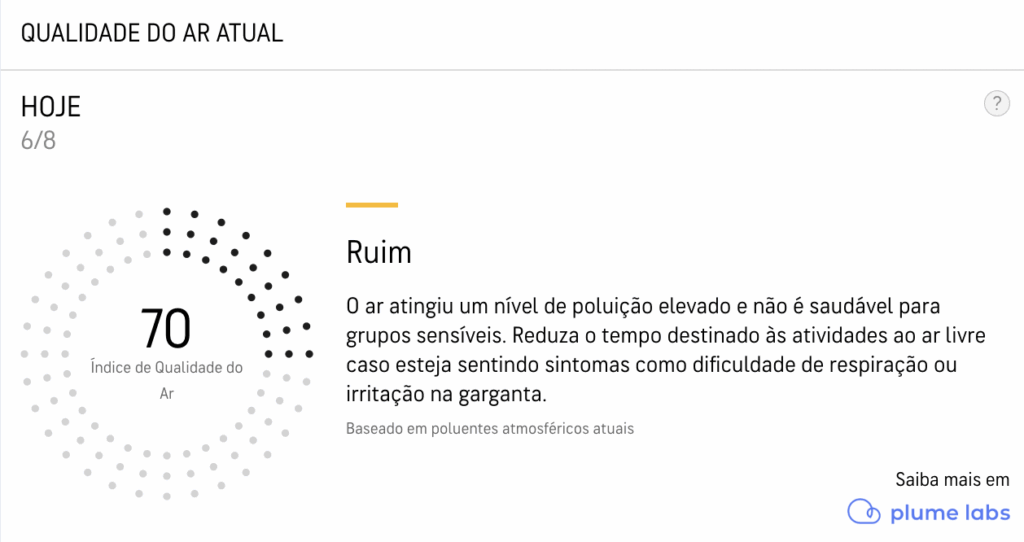 De acordo com o site meteorológico AccuWeather, a qualidade do ar em Manaus está em nível “Ruim” (70%), o que representa um perigo direto especialmente para grupos sensíveis, como crianças, idosos, asmáticos e pessoas com problemas cardíacos.