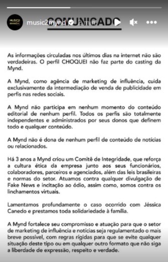 A Mynd8 afirmou publicamente em uma nota emitida em 26 de dezembro de 2023, após o trágico suicídio de Jéssica Canedo, que não possuía mais vínculos com a Choquei e que a página de fofoca estava fora de sua lista de clientes há pelo menos três anos, quando eles criaram um Comitê de integridade e ética.