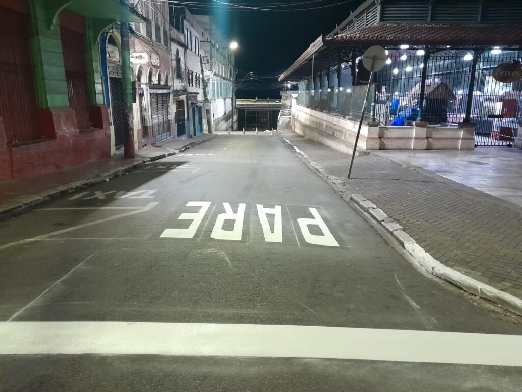Na zona Centro-Sul, a rua Conde de Tocantins, no bairro Flores, recebeu legendas “PARE” e faixas de retenção.