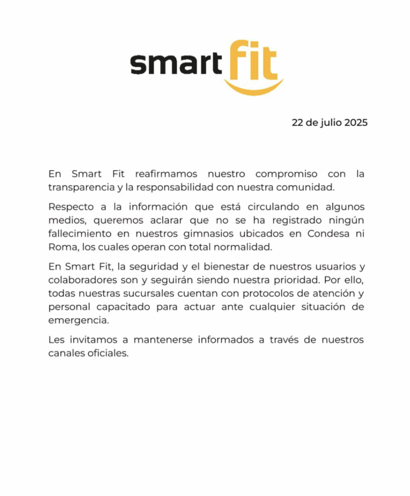 “Na Smart Fit reafirmamos nosso compromisso com a transparência e a responsabilidade com nossa comunidade. A segurança e o bem-estar de nossos usuários e colaboradores são e seguirão sendo nossa prioridade. Todas as nossas sucursais contam com protocolos de atenção e pessoal capacitado para atuar em situações de emergência”, diz trecho da nota.