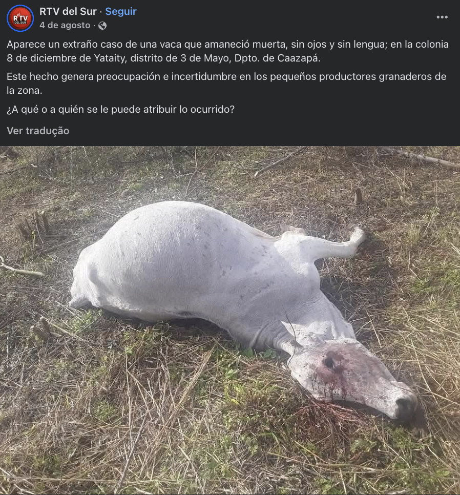 Néstor Ávalos Morel, um pecuarista local, ficou perplexo ao encontrar uma de suas vacas morta, com a língua cortada de forma tão precisa que parecia obra de um bisturi. Os olhos também haviam sumido. Ele compartilhou fotos nas redes sociais, que rapidamente viralizaram. “Não havia pegadas, nem marcas de dentes. Quem faz isso?”, questionou Néstor, cuja angústia ecoou entre os vizinhos.