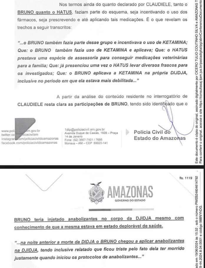 “Ele ficou triste pelo fato dela [Djidja Cardoso] ter morrido justamente quando iniciou os protocolos de anabolizantes”, diz um trecho do documento, também diz um trecho do inquérito.
