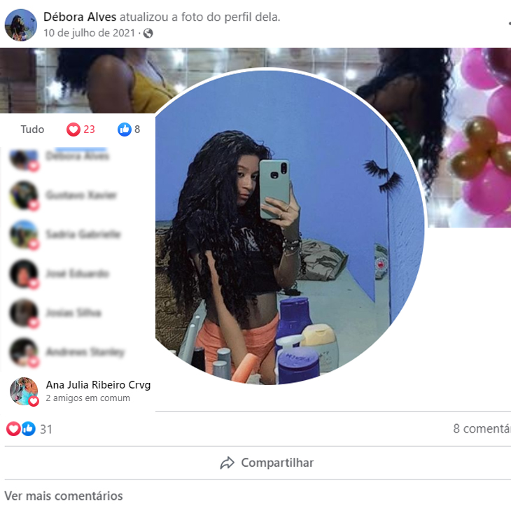 Nas redes sociais, Ana Julia mostrou sinais de que conhecia Débora, chegando a curtir postagens da jovem. A mulher chegou a dar um “amei” na foto de Débora no perfil pessoal da vítima no Facebook. A foto foi postada por Débora em julho de 2021, quando a vítima tinha 16 anos.