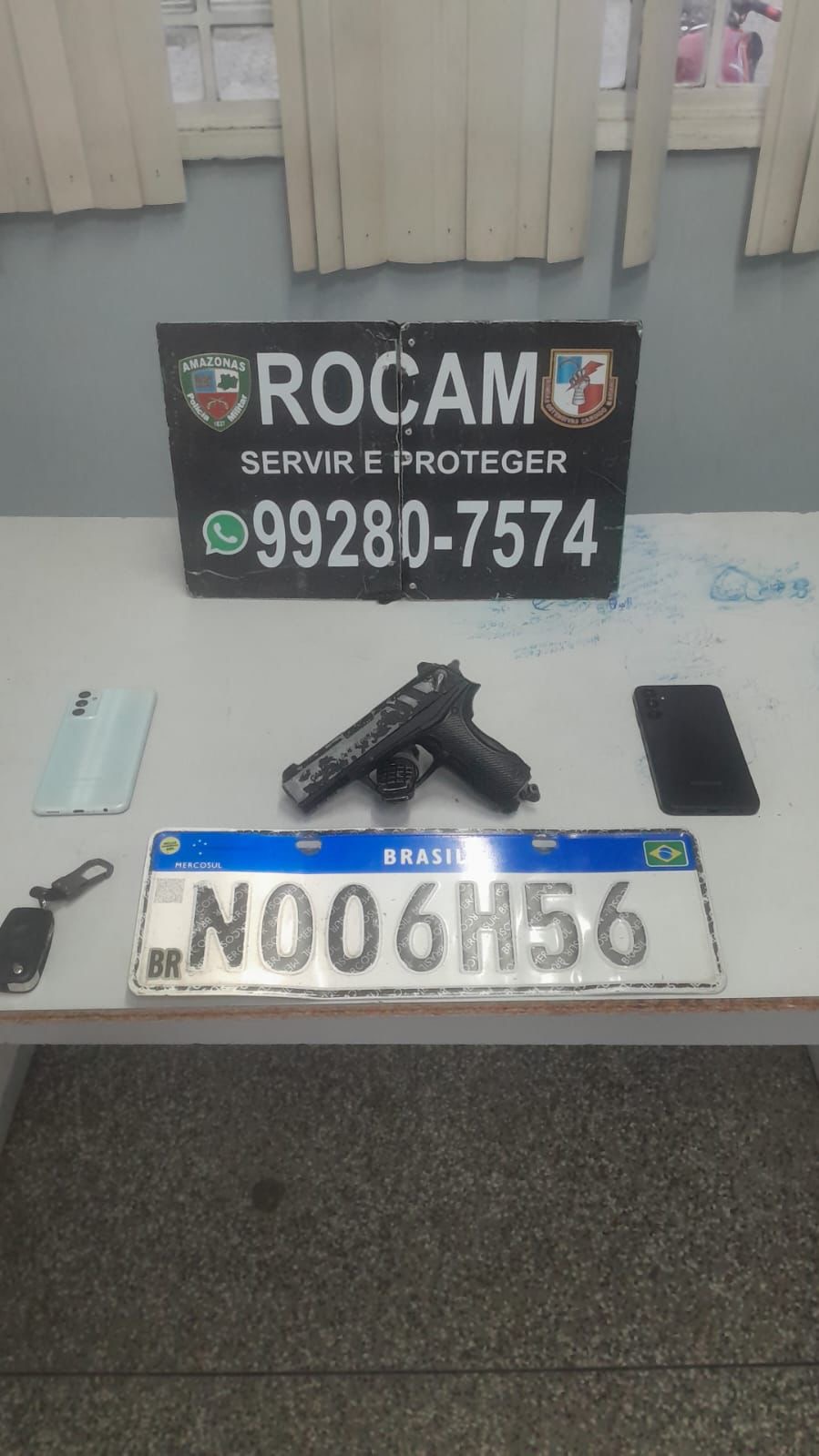 Ao realizar buscas na área, os policiais identificaram o veículo e abordaram os dois suspeitos que estavam em seu interior. Na revista, foi encontrada também uma arma de fogo falsa, que teria sido utilizada para intimidar vítimas durante ações criminosas.