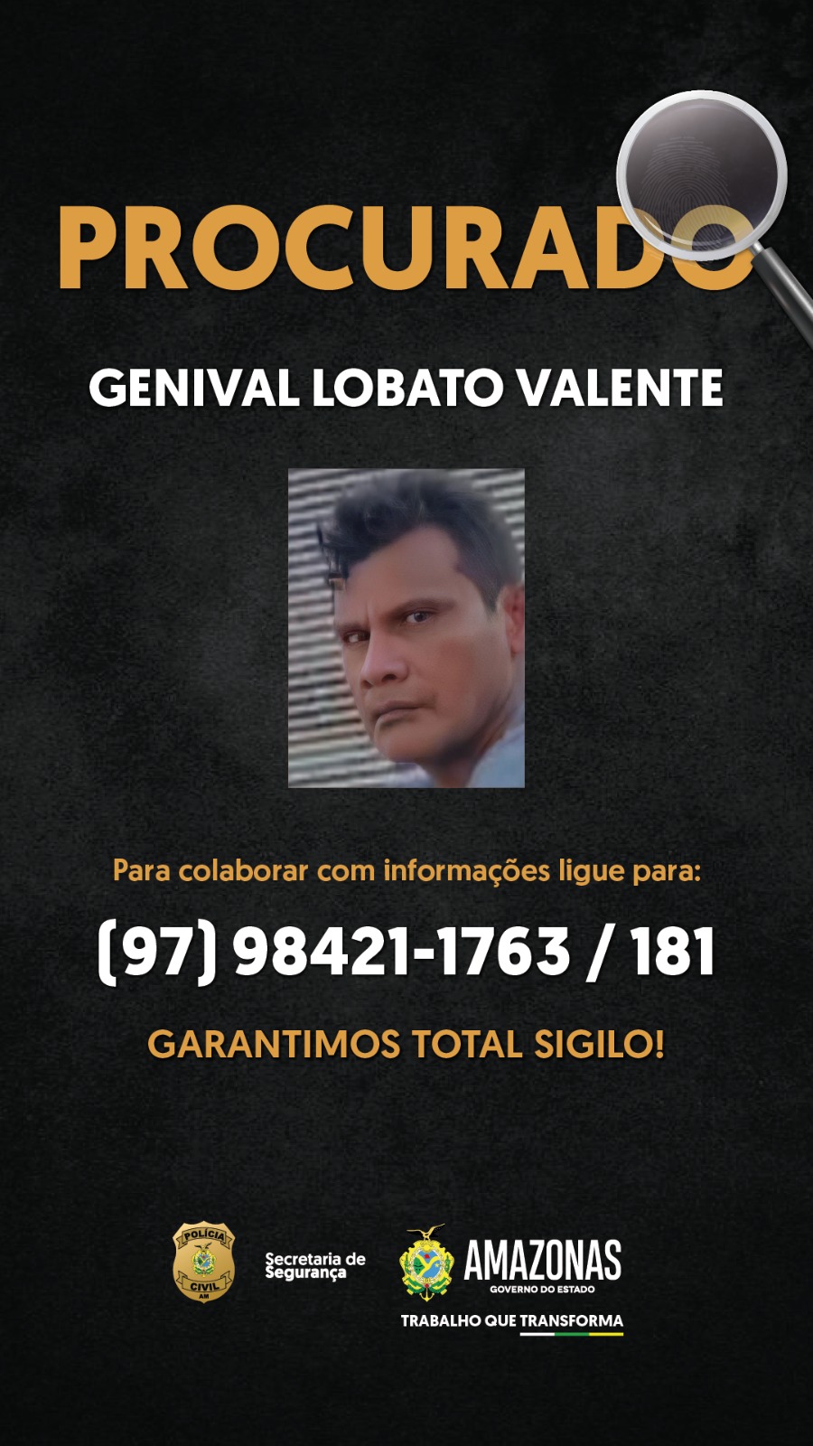 A PC-AM solicita que qualquer informação sobre o paradeiro de Genival Lobato Valente seja comunicada pelos números (97) 98421-1763, disque-denúncia da DEP de Humaitá, ou pelo 181, da Secretaria de Segurança Pública do Amazonas (SSP-AM). “A identidade do denunciante será preservada”, garantiu a autoridade policial.
