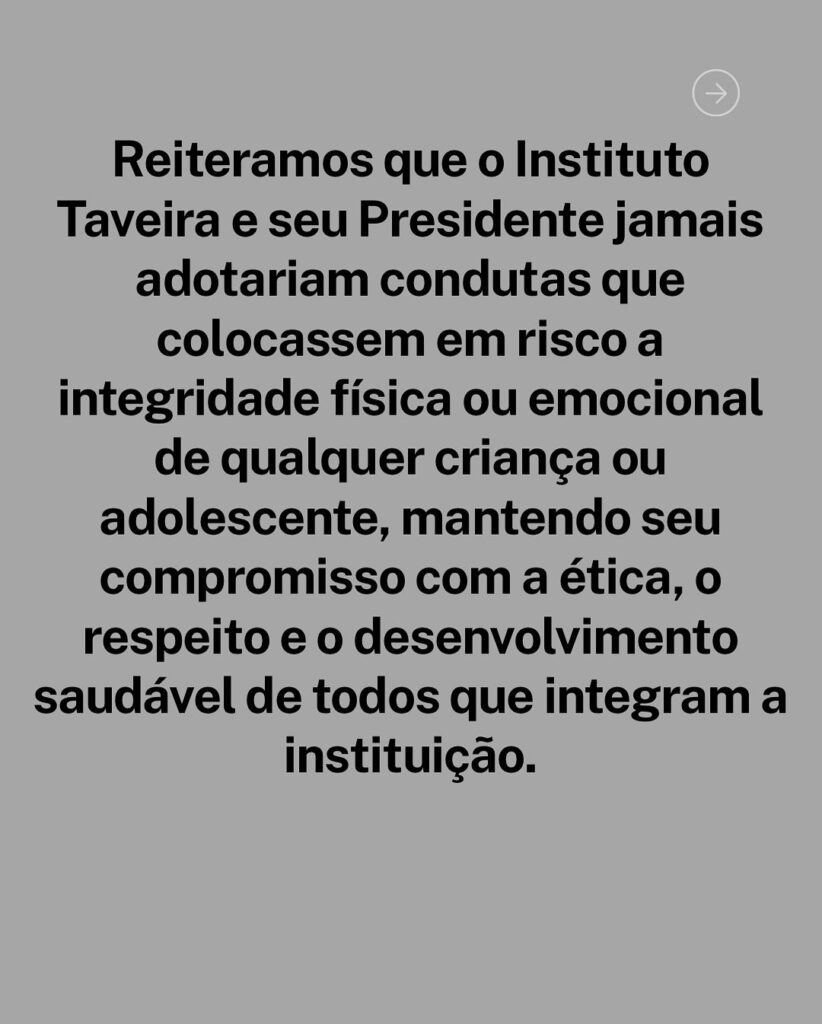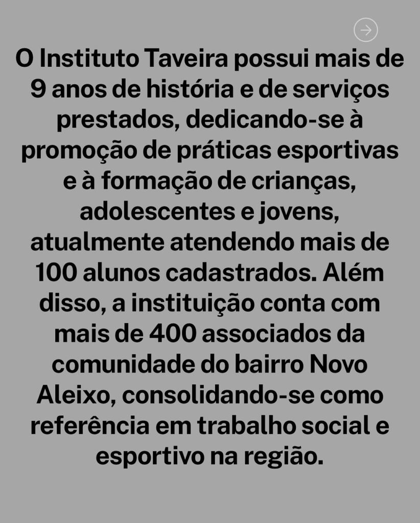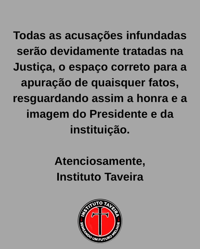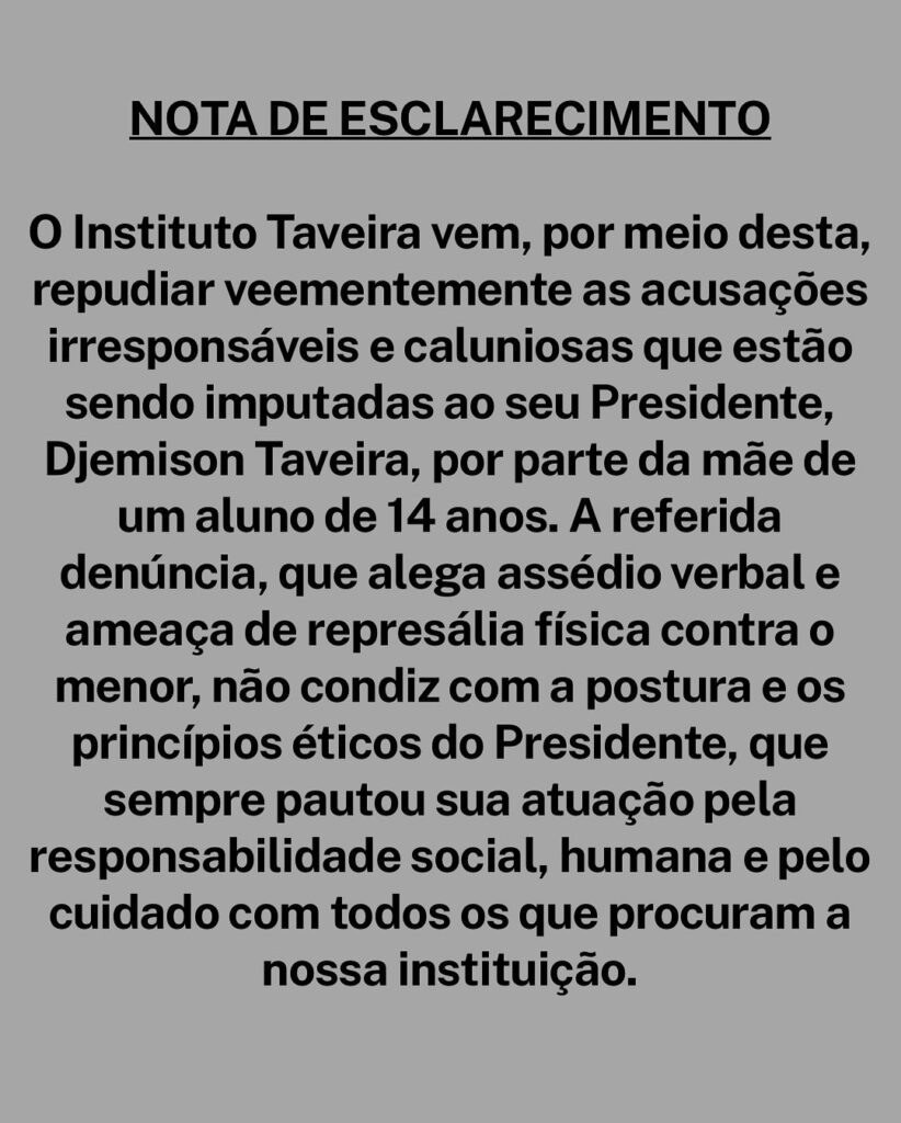 Em nota oficial, o Instituto Taveira repudiou as acusações, classificando-as como “irresponsáveis e caluniosas”. O comunicado destaca que Djeimison Taveira, presidente da instituição, sempre agiu com ética e responsabilidade social, atendendo mais de 100 alunos e 400 associados no bairro Novo Aleixo ao longo de nove anos. “O Instituto e seu presidente jamais adotariam condutas que colocassem em risco a integridade física ou emocional de qualquer criança ou adolescente”, afirma a nota, que promete tratar as acusações na Justiça para “resguardar a honra e a imagem” de Taveira e da instituição.