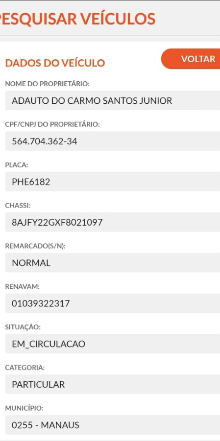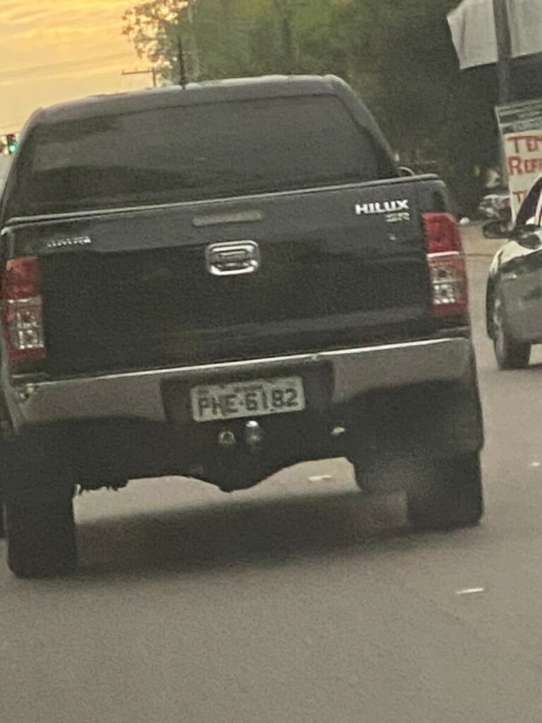 O veiculo, modelo picape Hilux, de cor preta, e placa PHE6182, está registrado no nome de Adauto do Carmo e está apto a circulação.