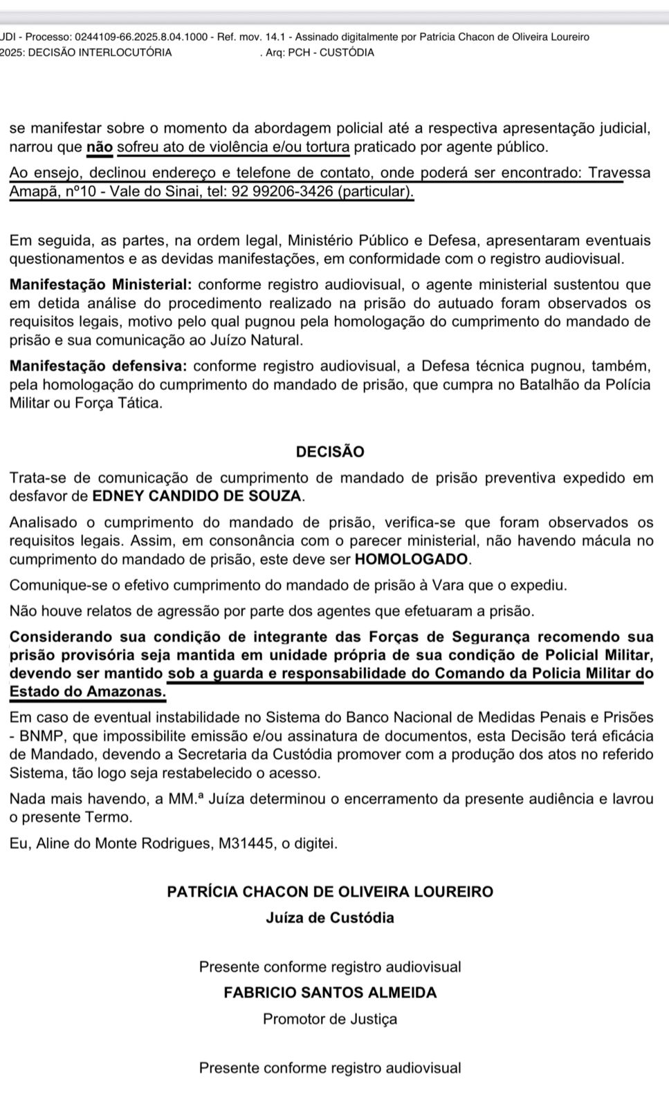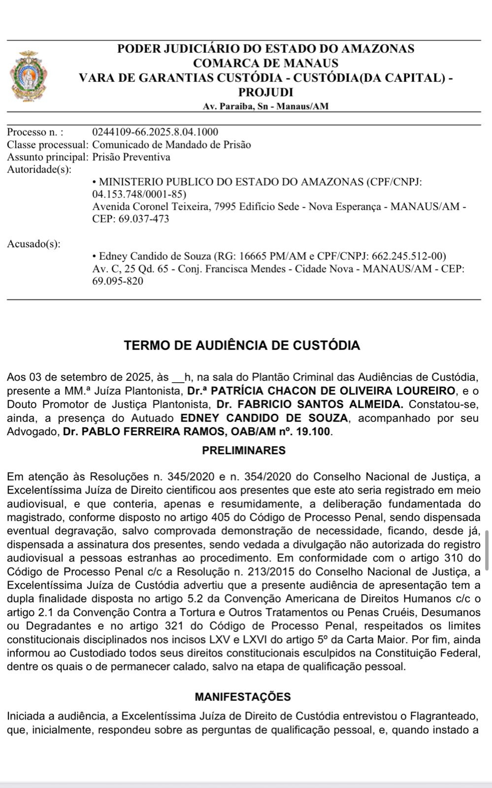 Edney se apresentou na Delegacia da Mulher Norte/Leste, acompanhado de um advogado ainda na quarta. Durante a audiência, ele exerceu o direito de permanecer em silêncio e a juíza Patrícia Chacon de Oliveira Loureiro decidiu manter a prisão do PM. Por ser policial, ele ficará preso em unidade específica da Polícia Militar, sob responsabilidade do comando da corporação.