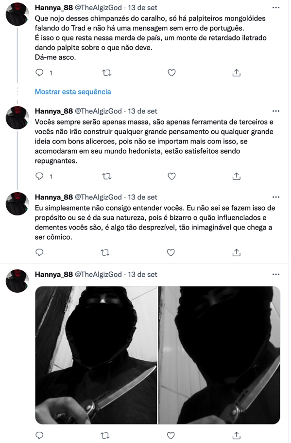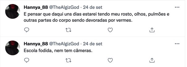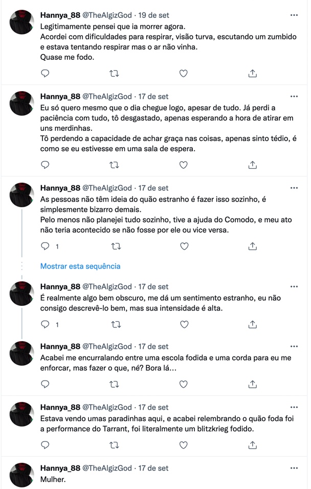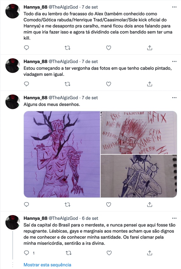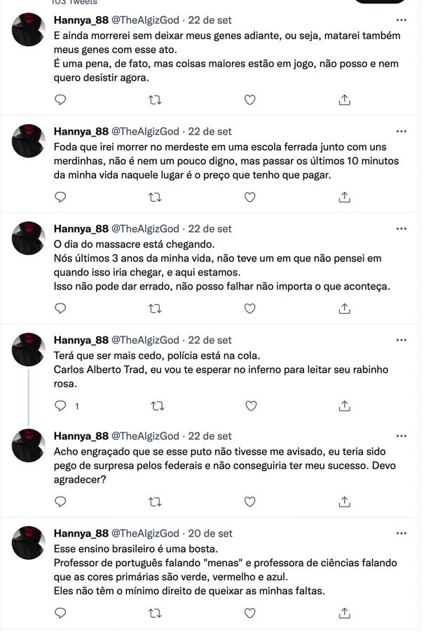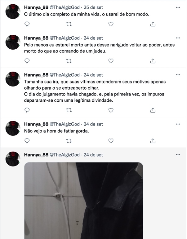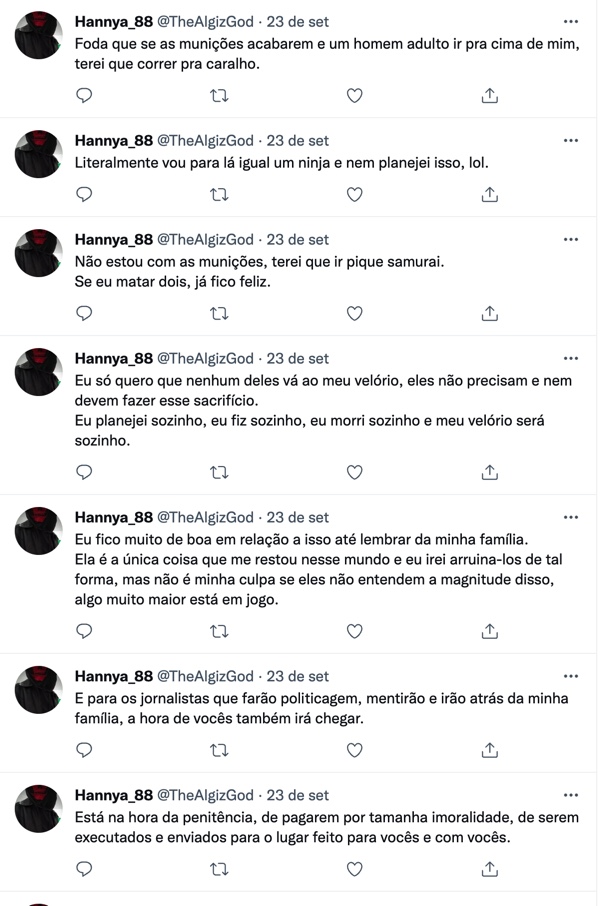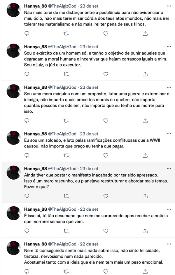 Nas redes socais, o garoto se apresentava como Hannya_88, @TheAlgizGod, e apresentava uma cosmovisão niilista e nazista. O rapaz chegava a se identificar como um ser “superior” e chegou a planejar o ato criminoso com meses de antecedência. Segundo postagens na própria rede social, garoto teria tido conselhos de terceiros e ainda teria mais um ajudante, que acabou desistindo de cometer o crime. O jovem também detalhou sua ideologia extremista em um manifesto de 29 páginas.