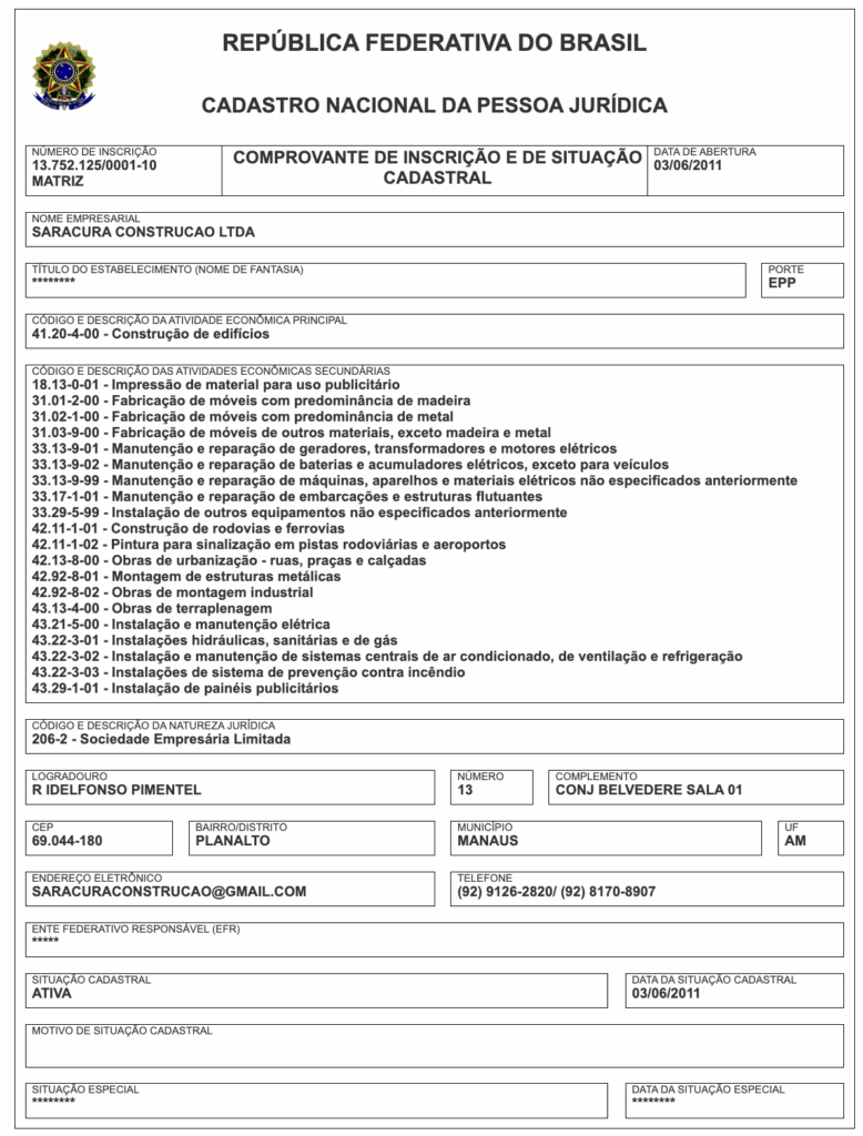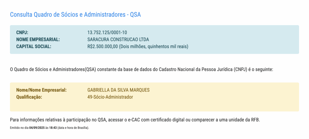 A Saracura Construção, fundada em 2011 e sediada no bairro Planalto, zona centro-oeste de Manaus, é de propriedade de Gabriella da Silva Marques e possui capital social de R$ 2,5 milhões, estando enquadrada como Empresa de Pequeno Porte (EPP).