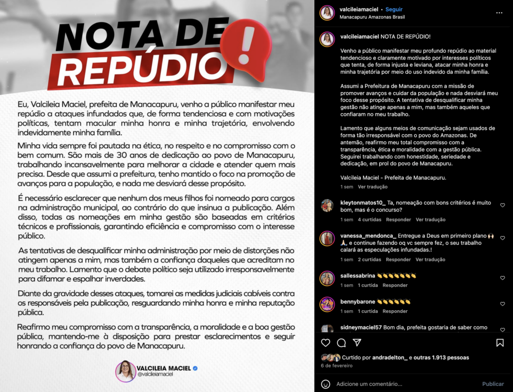 A população de Manacapuru, que esperava uma mudança com a nova gestão, vê agora questionada a integridade e a ética da administração de Valcileia Maciel. O caso reforça a necessidade de maior vigilância e transparência nas nomeações públicas, garantindo que o serviço público seja pautado pelo bem-estar coletivo e não por interesses pessoais ou familiares.