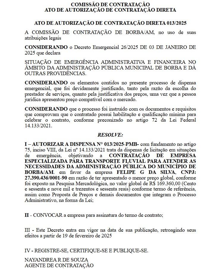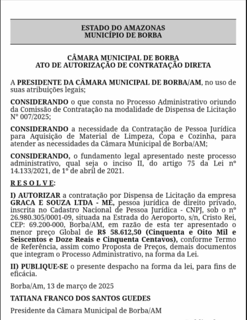 Além disso, a própria Câmara Municipal, sob a presidência de Tatiana Franco, contratou por dispensa de licitação a empresa Graça e Souza LTDA – ME, com sede em Borba, por R$ 58.612,50, para fornecimento de materiais de limpeza, copa e cozinha. A contratação foi assinada pela vereadora.