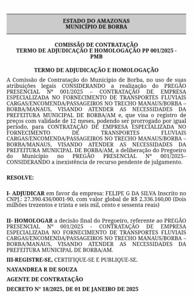 Documentos mostram que a empresa Felipe G. da Silva, de propriedade do cunhado da vereadora, foi contratada por meio do Pregão Presencial nº 001/2025 para prestar serviços de transporte fluvial de passageiros, cargas e encomendas entre Manaus e Borba.