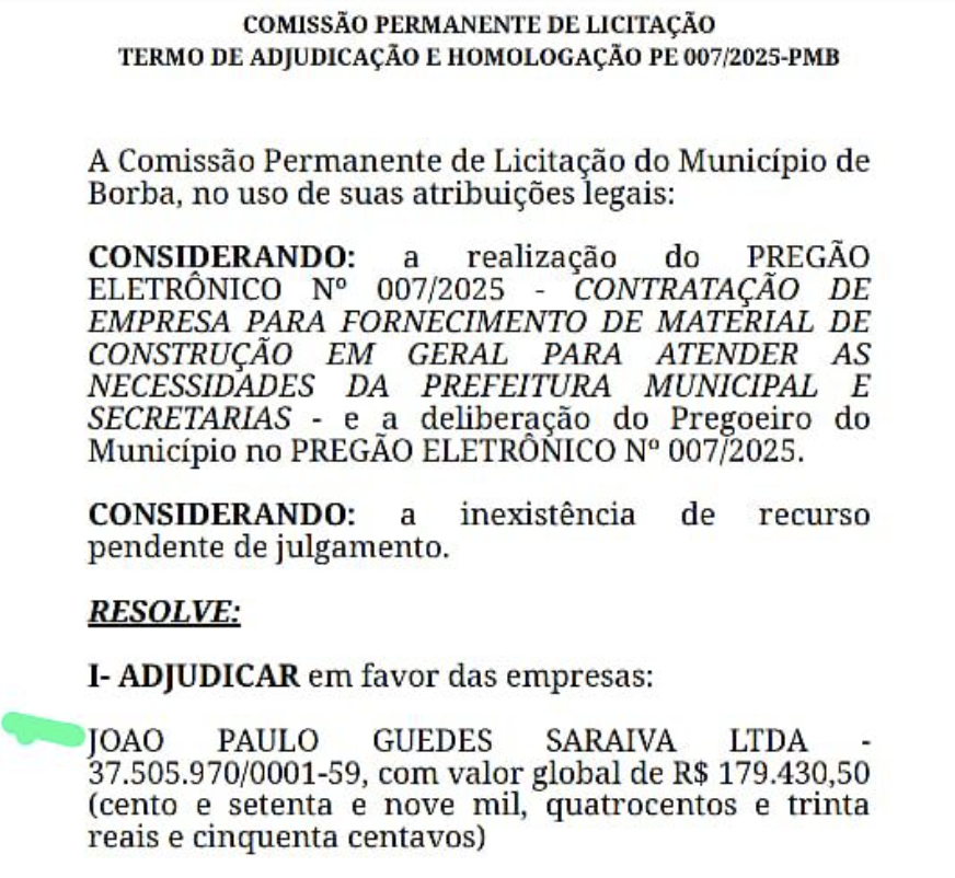 Outros dois contratos foram firmados com os sobrinhos da vereadora: João Paulo Guedes Saraiva e Diego da C. Graça. Apesar de João Paulo ser proprietário de uma loja de autopeças (Gordo Auto Peças) e Diego de um mercadinho (Mercadinho Beira Rio), ambos foram vencedores do Pregão Eletrônico nº 007/2025 para fornecimento de materiais de construção. João Paulo venceu com um contrato de R$ 179.430,50, e Diego com outro de R$ 189.931,00.