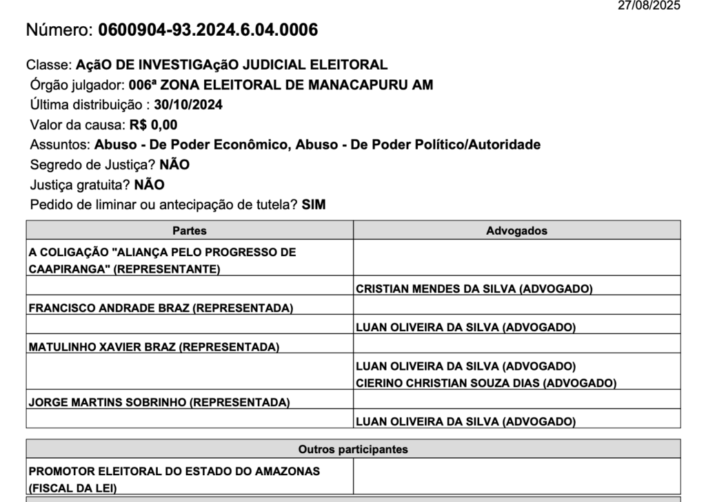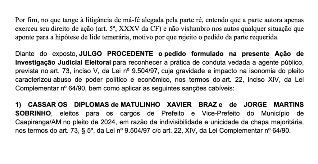 Amazonas – A Justiça Eleitoral da 6ª Zona Eleitoral de Manacapuru, julgou procedente a Ação de Investigação Judicial Eleitoral (AIJE) movida pela coligação “Aliança pelo Progresso de Caapiranga” e determinou a cassação dos diplomas do prefeito Matulinho Xavier Braz e do vice-prefeito Jorge Martins Sobrinho, eleitos no pleito de 2024.