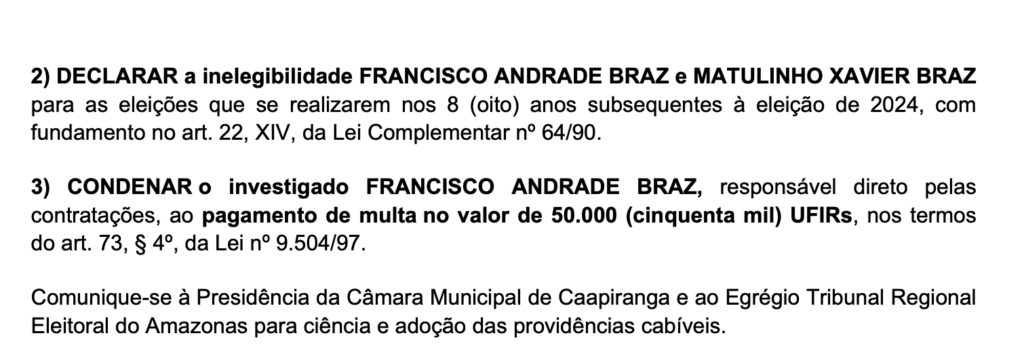 Também foi determinada a inelegibilidade por oito anos do prefeito Matulinho Braz e do ex-prefeito Francisco Andrade Braz, além da aplicação de multa a este último.