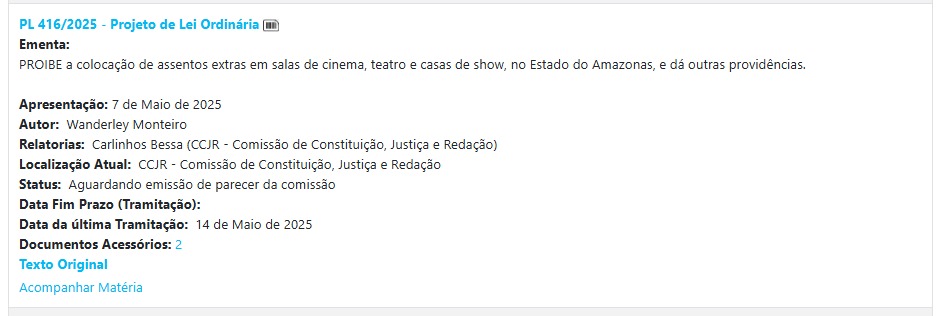 PL que propõe proibir assentos extras em cinemas, teatros e casas de show no Amazonas