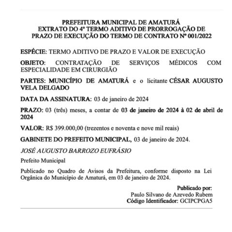 O 4º termo aditivo de prorrogação de nº 001/2022, foi assinado no dia 3 de janeiro de 2024 e publicado no Diário Oficial Eletrônico dos Municípios do Estado do Amazonas, na edição desta quarta-feira (27). O prazo para início dos serviços é de 3 de janeiro até 2 de abril deste ano.