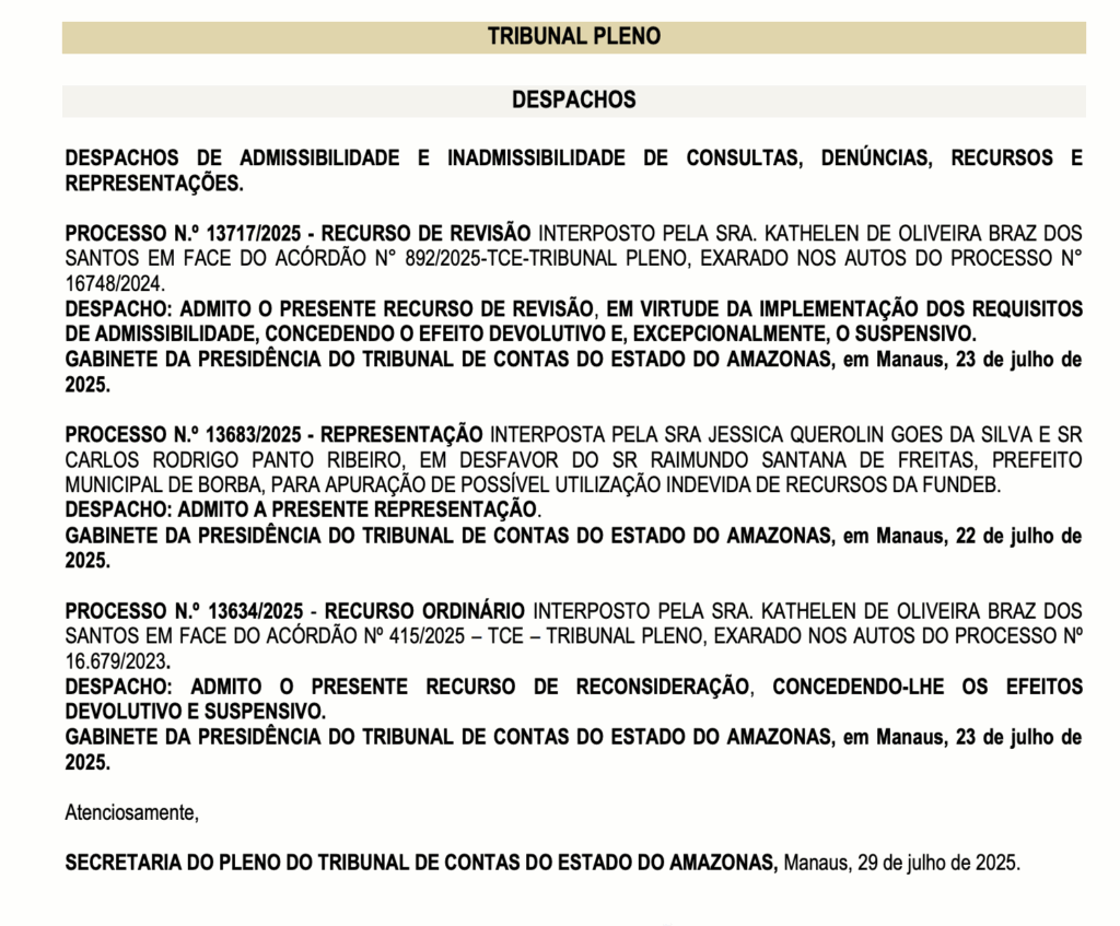 A denúncia, registrada sob o número 13683/2025, foi considerada admissível e seguirá agora para apuração técnica no tribunal.