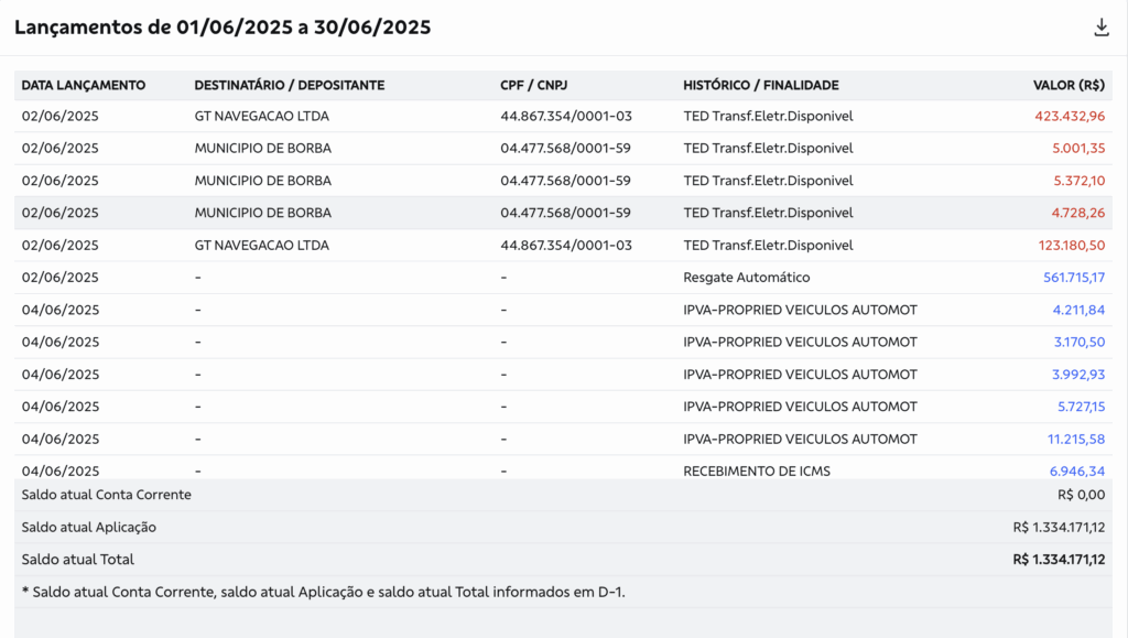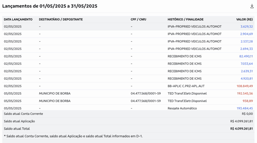 O Portal e TV CM7 Brasil, teve acesso com exclusividade aos extratos bancários que escancaram a dimensão do escândalo, entre janeiro e julho deste ano, o município de Borba recebeu mais de R$ 36 milhões em repasses do Fundeb.