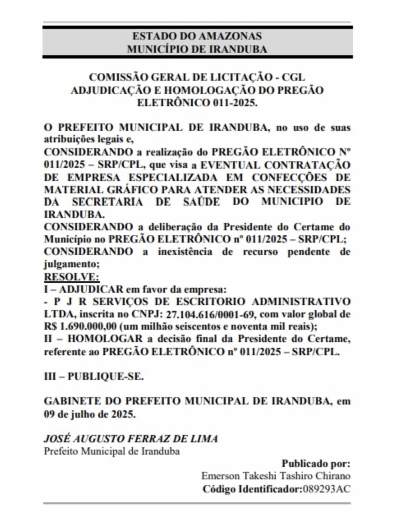 O acordo, firmado por meio do pregão nº 011/2025-SRL/CPL, solicita a contratação de uma “empresa especializada em confecção de material gráfico” para atender demandas da Saúde Municipal.