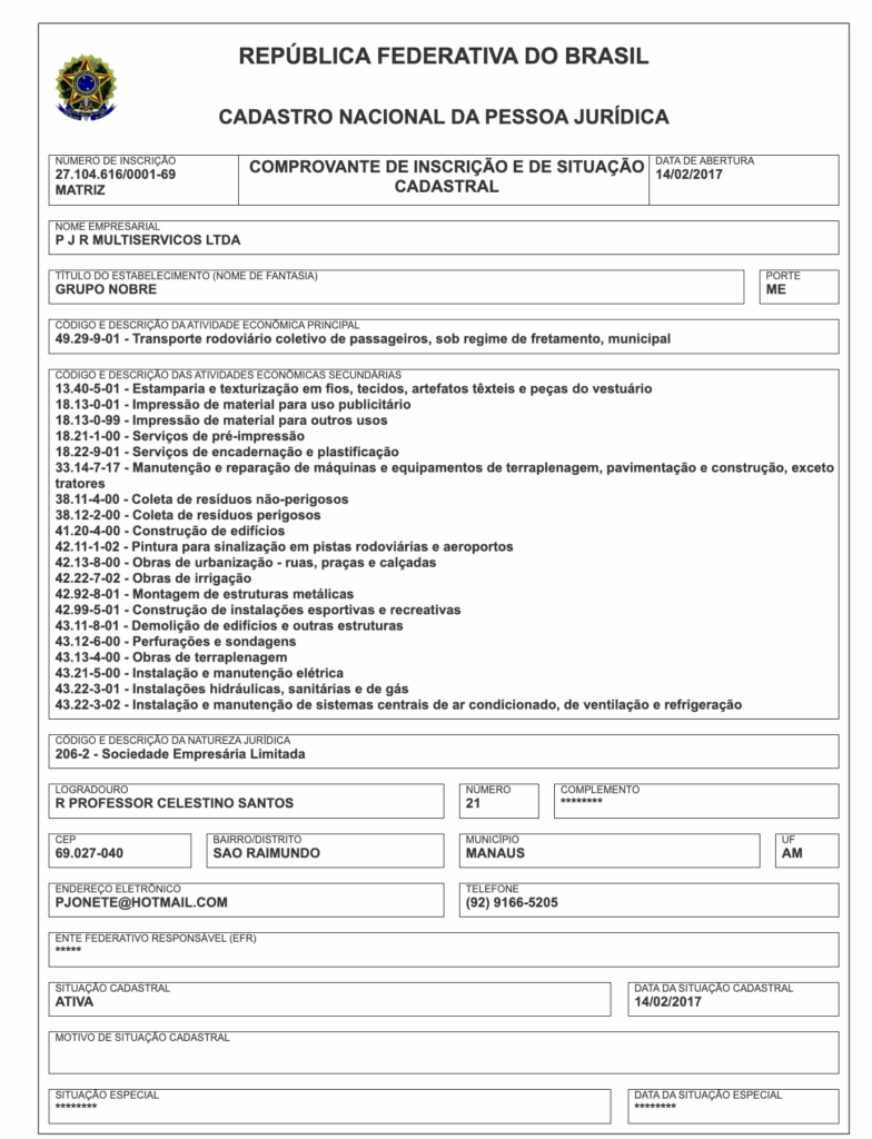 Além disso, a razão social da empresa aparece de forma divergente em diferentes registros oficiais: ora como P J R Multiserviços LTDA, ora como Grupo Nobre.