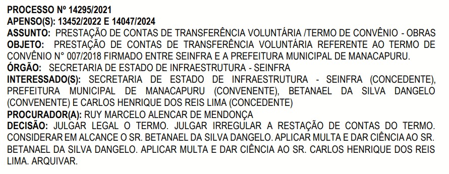 Amazonas – O ex-prefeito de Manacapuru, Betanael da Silva D’Ângelo, foi multado pelo Tribunal de Contas do Estado do Amazonas (TCE-AM) após a prestação de contas de um convênio com a Secretaria de Estado de Infraestrutura (SEINFRA) ser considerada irregular. A penalidade também atingiu Carlos Henrique dos Reis Lima, outro responsável pelo termo.