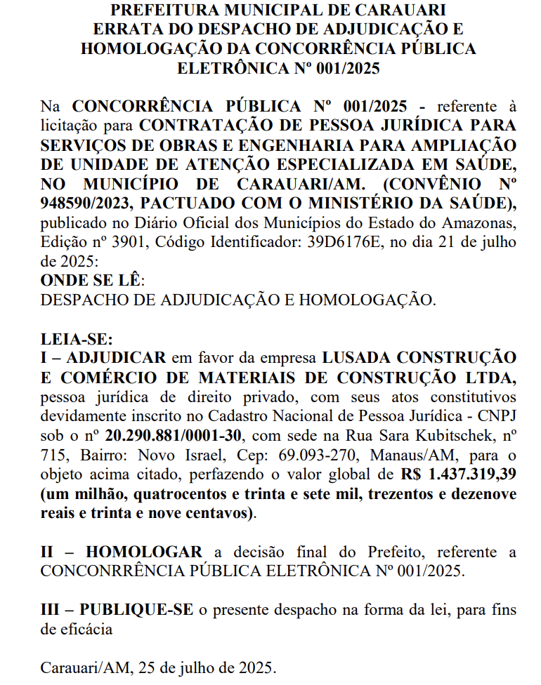 O despacho de adjudicação e homologação, assinado pelo prefeito Jose Airton Freitas Siqueira, determina a contratação da empresa com sede na Rua Sara Kubitschek, nº 715, bairro Novo Israel, em Manaus, para executar a obra vinculada ao Convênio nº 948590/2023, firmado com o Ministério da Saúde.