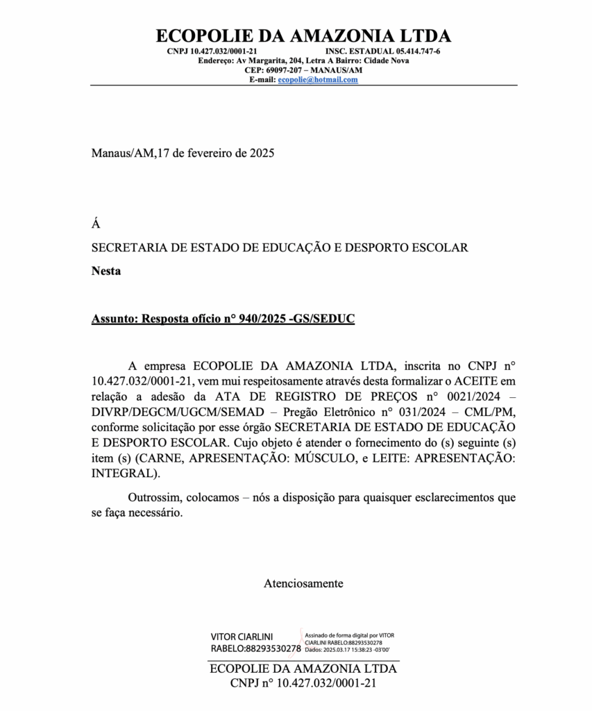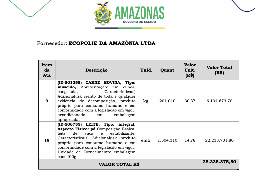 Amazonas – O Governo do Amazonas, por meio da Secretaria de Estado de Educação (Seduc), firmou um contrato superior a R$ 28 milhões com a empresa ECOPOLIE DA AMAZONIA LTDA, de propriedade de Vitor Ciarline Rabelo, a empresa está localizada na Av. Margarita, 204, bairro Cidade Nova, Manaus, para o fornecimento de alimentos destinados à merenda escolar das escolas estaduais.