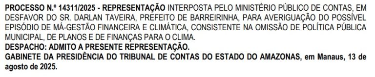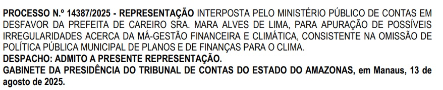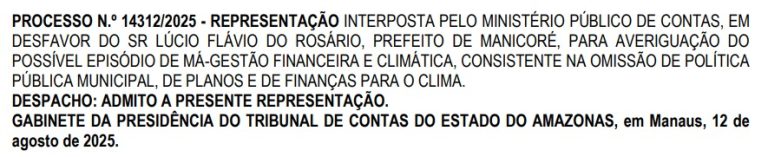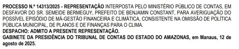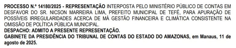 Manaus – O Tribunal de Contas do Estado do Amazonas (TCE-AM) acatou representações do Ministério Público de Contas contra dez prefeituras do interior amazonense por supostos episódios de má gestão financeira e omissão de políticas públicas voltadas ao enfrentamento da crise climática. As notificações foram emitidas entre os dias 11 e 13 de agosto e publicadas no Diário Oficial da Corte.