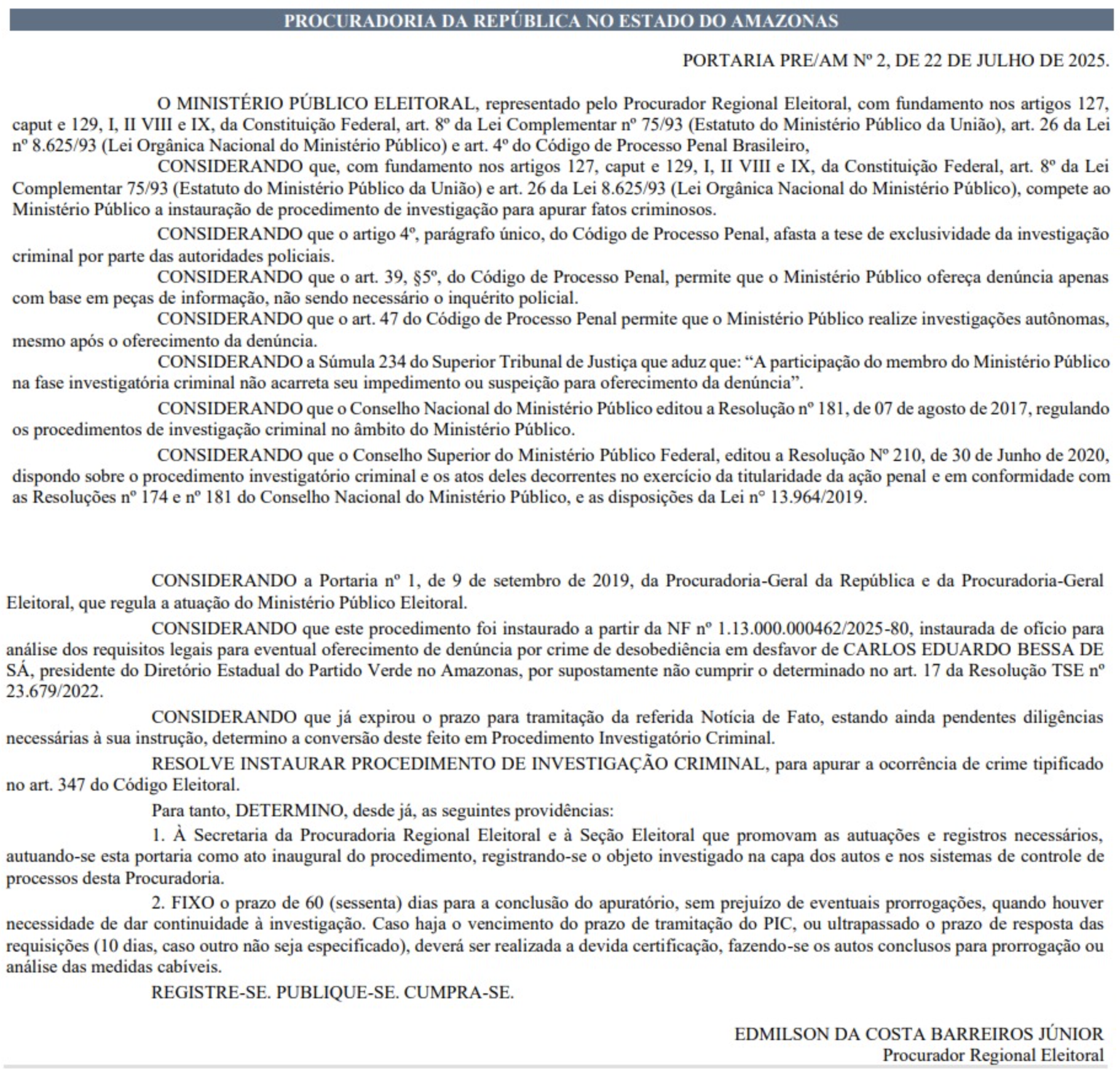Amazonas – O Ministério Público Eleitoral (MPE) do Amazonas abriu um Procedimento de Investigação Criminal (PIC) contra o deputado estadual Carlinhos Bessa (PV), que também preside o Diretório Estadual do Partido Verde no estado. A investigação apura possível prática de desobediência eleitoral, prevista no artigo 347 do Código Eleitoral.