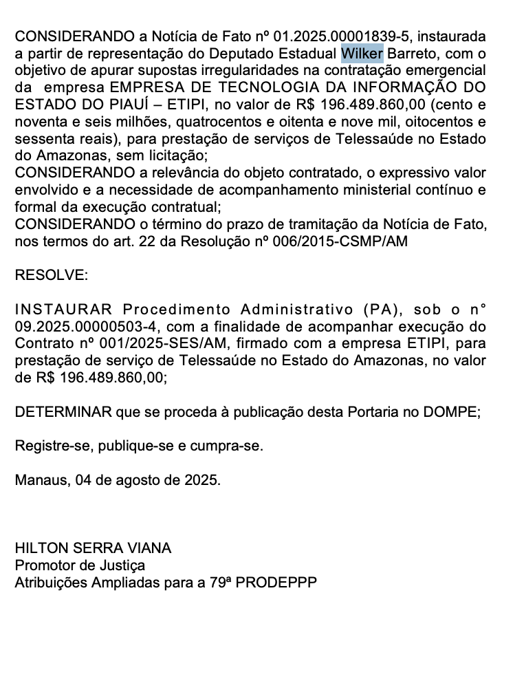 O procedimento tem origem na Notícia de Fato nº 01.2025.00001839-5, instaurada após representação feita pelo deputado estadual Wilker Barreto, que questionou a contratação emergencial da ETIPI para a prestação de serviços de Telessaúde no estado, sem licitação.
