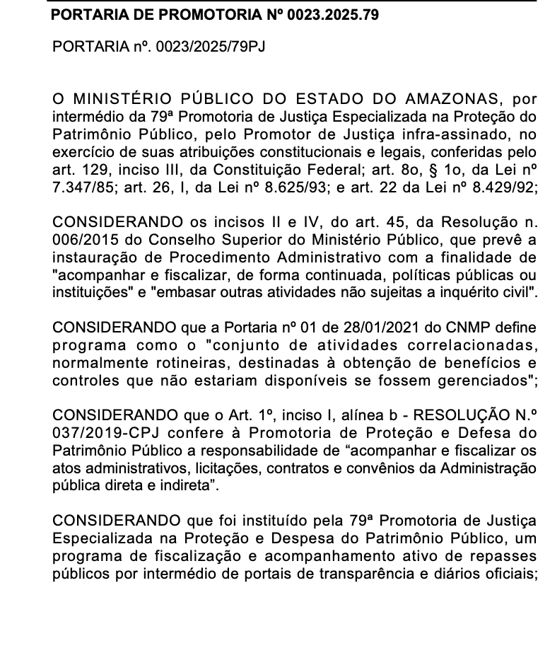 A Promotoria justificou a abertura do procedimento com base em diversas normativas, como a Constituição Federal, as leis que regem o Ministério Público e a Lei de Improbidade Administrativa, além das resoluções do Conselho Nacional do Ministério Público (CNMP) e do Conselho Superior do MPAM.