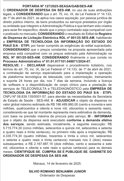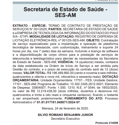 Manaus – O Ministério Público do Estado do Amazonas (MPAM), por meio da 79ª Promotoria de Justiça Especializada na Proteção do Patrimônio Público, instaurou um Procedimento Administrativo (PA) para acompanhar a execução do contrato nº 001/2025 firmado pela Secretaria de Estado de Saúde (SES/AM) com a empresa Empresa de Tecnologia da Informação do Estado do Piauí (ETIPI), no valor de R$ 196.489.860,00.