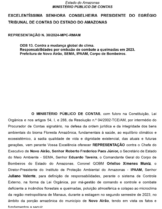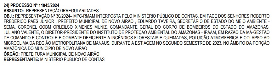 Além do ex-gestor, a denúncia também aponta a responsabilidade de representantes de órgãos ambientais e do Corpo de Bombeiros, acusados de falhas na resposta institucional diante da crise climática que afetou a região metropolitana de Manaus. Segundo o MPC, houve omissão no controle e combate aos incêndios florestais, o que agravou a poluição do ar e contribuiu para o colapso climático registrado em diversas áreas do estado.