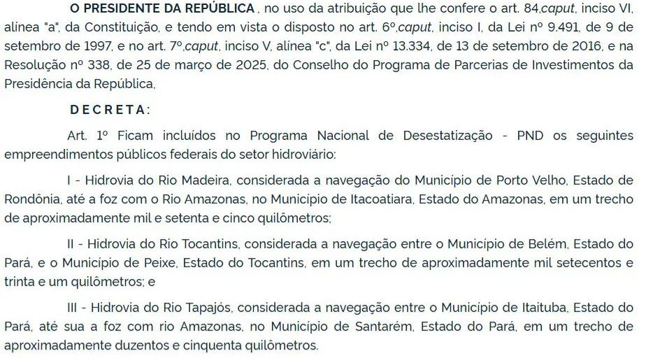 Pelo decreto, as hidrovias do Madeira (que liga Porto Velho a Itacoatiara), do Tocantins e do Tapajós entram no plano de privatização.