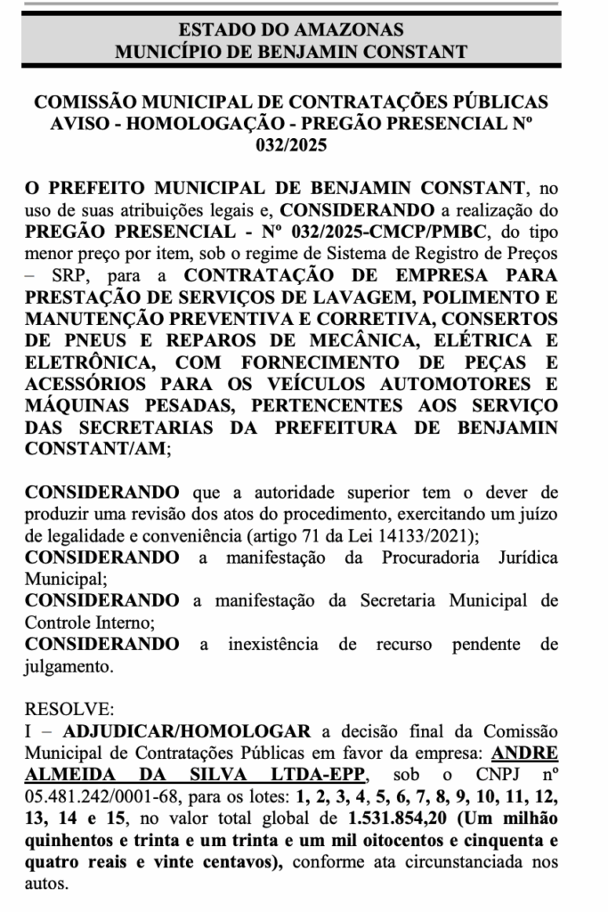 A criatividade está no setor de licitações públicas. A prefeitura do município acaba de firmar um contrato milionário, no valor de R$ 1.531.854,20, com a empresa André Almeida da Silva LTDA-EPP, para realizar serviços especializados como lavagem, polimento, manutenção preventiva e corretiva de veículos, consertos de pneus, reparos em sistemas mecânicos, elétricos e eletrônicos, além do fornecimento de peças e acessórios para a frota do município, incluindo máquinas pesadas.