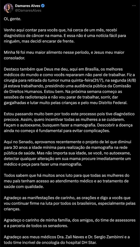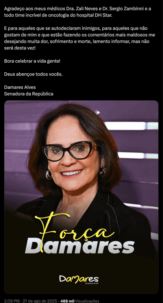 Paralelamente, Damares Alves revelou, também na quarta-feira, um diagnóstico de câncer de mama em estágio inicial. Durante reunião no Senado, a senadora compartilhou que está respondendo bem ao tratamento e usou as redes sociais para destacar a importância da prevenção. “Façam os exames, cuidem da saúde. A detecção precoce salva vidas”, escreveu, em uma mensagem que gerou comoção entre apoiadores e colegas.