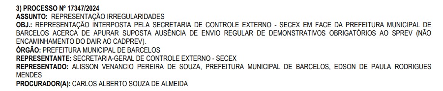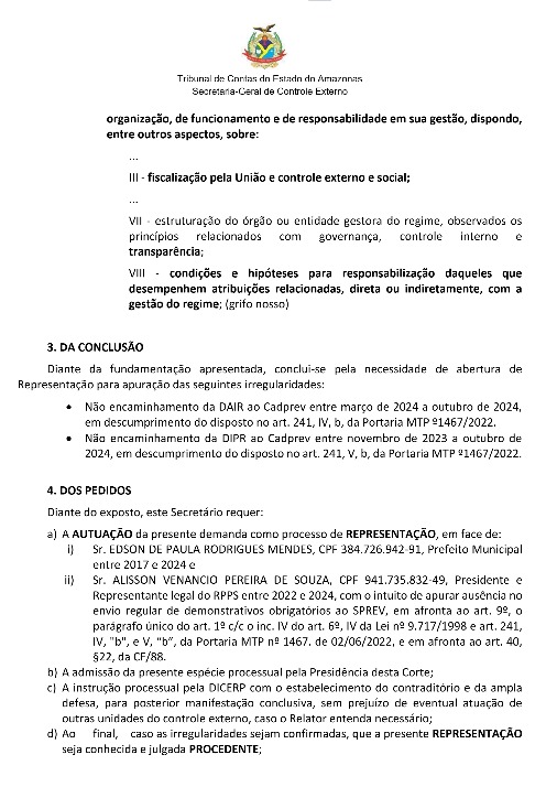Amazonas – O Tribunal de Contas do Estado do Amazonas (TCE-AM), irá deliberar sobre uma representação que aponta possíveis falhas administrativas envolvendo o ex-prefeito de Barcelos, Edson de Paula Rodrigues Mendes, e o então presidente do Regime Próprio de Previdência Social (RPPS) do município, Alisson Venâncio Pereira de Souza.