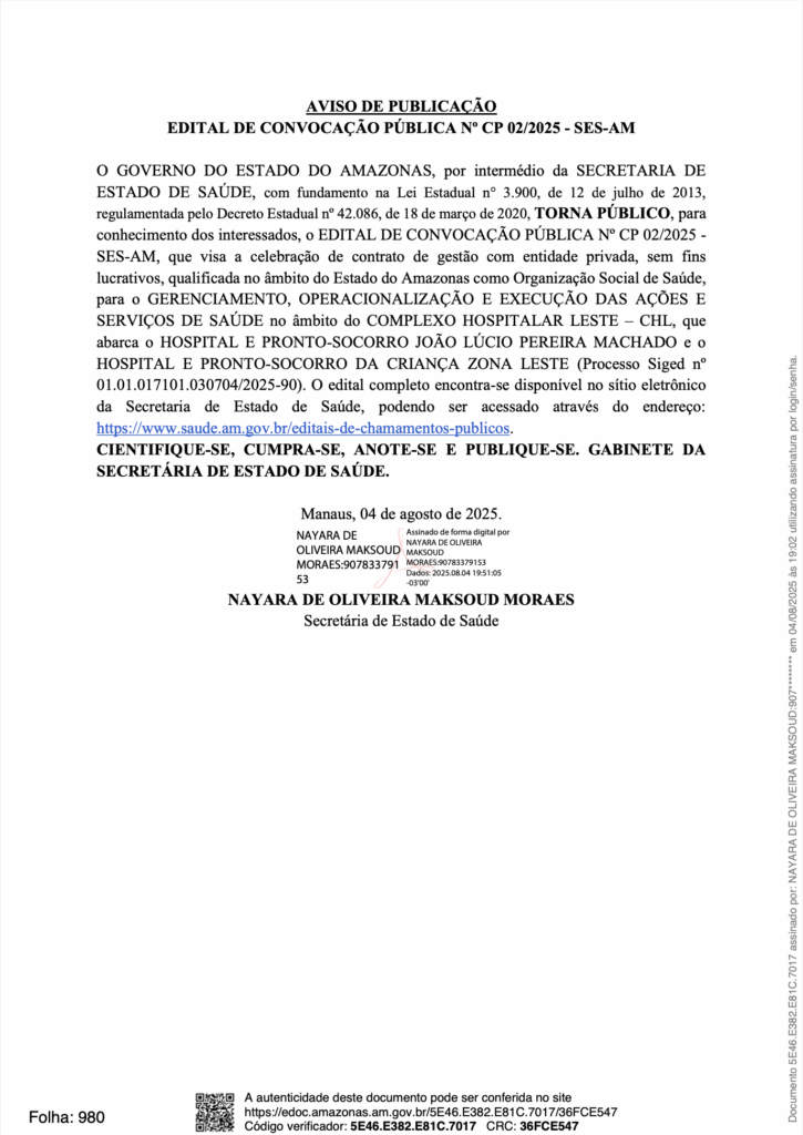 Manaus – O governador Wilson Lima (UB) autorizou, por meio da Secretaria de Estado de Saúde do Amazonas (SES-AM), um contrato bilionário que entrega a gestão de dois dos principais hospitais públicos da capital para uma organização social (OS). O Edital de Convocação Pública nº 02/2025, publicado nesta segunda-feira (11), prevê a transferência da administração completa do Hospital e Pronto-Socorro João Lúcio Pereira Machado e do Hospital da Criança da Zona Leste — ambos localizados na zona leste de Manaus — pelo valor de R$ 1.969.149.047,30.
