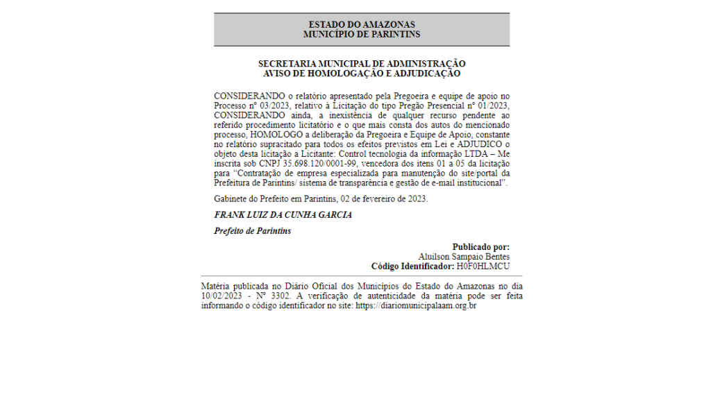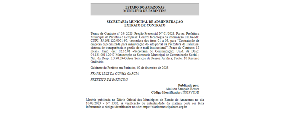 Amazonas – A prefeitura de Parintins na gestão de Bi Garcia (União Brasil) está contratando a Conttrol Tecnologia da Informação LTDA, que atua com nome fantasia Conttrol Sistemas, para gerir o Portal da Transparência da Prefeitura de Parintins. A informação foi publicada no Diário Oficial do Estado do Amazonas no dia 2 de fevereiro, sem a divulgação do valor total do contrato, que só pôde ser consultado no portal da Transparência.