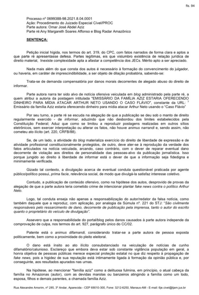 O senador Omar Aziz recentemente relatou ter sido vítima de uma notícia mentirosa e ofensiva veiculada no blog de Any Margareth. Ele relata que a blogueira é a autora da postagem intitulada “EMISSÁRIO DA FAMÍLIA AZIZ ESTARIA OFERECENDO DINHEIRO PARA MÍDIA ATACAR ARTHUR NETO USANDO O CASO FLÁVIO”.