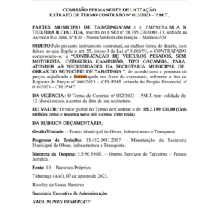 Um Extrato de Termo de Contrato, de número 012/2023, revela que Bemerguy vai gastar mais de R$ 2,1 milhões em um contrato de 12 meses com a empresa M. A. N. Teixeira e Cia Ltda, com CNPJ n° 20.765.220/0001-13.