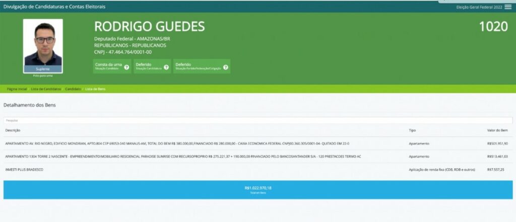 Manaus – O vereador Rodrigo Guedes (Republicanos) desde que se tornou político, saiu de R$ 0 em bens declarados para exatos R$ 1.022.970,18 (um milhão, vinte e dois mil, novecentos e setenta reais e dezoito centavos) em poucos anos. O valor adquirido pelo parlamentar é um ótimo patrimônio para quem se diz pouco interessado no dinheiro e sim pela nobreza das causas.