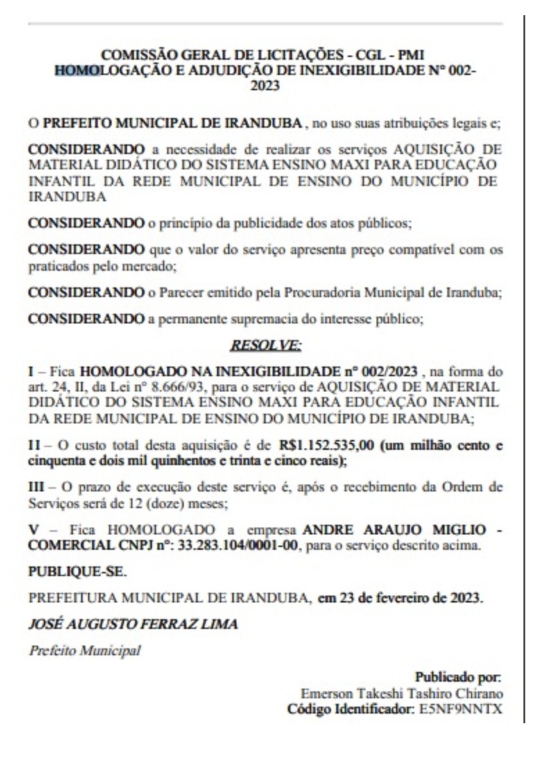 Amazonas – A Prefeitura Municipal de Iranduba, sob o comando do prefeito Augusto Ferraz (Uniao Brasil), gastará mais de R$ 1,1 milhão na compra de materiais didáticos para educação infantil. No documento, publicado no dia 23 de fevereiro de 2023, não constam detalhes importantes da compra, como os tipos de materiais, quantidades e valores unitários.