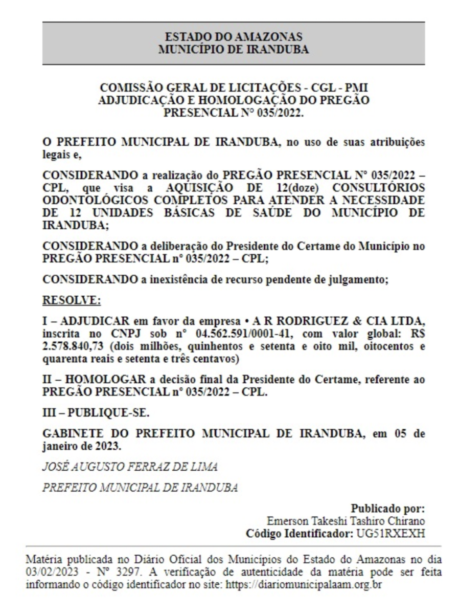 Em março deste ano, a Prefeitura de Iranduba firmou um contrato para gastar mais de R$ 2,5 milhões em 12 consultórios odontológicos completos para 12 unidades básicas de Saúde do município, segundo contrato publicado no Diário Oficial. No entanto, também não havia detalhes da compra no contrato.