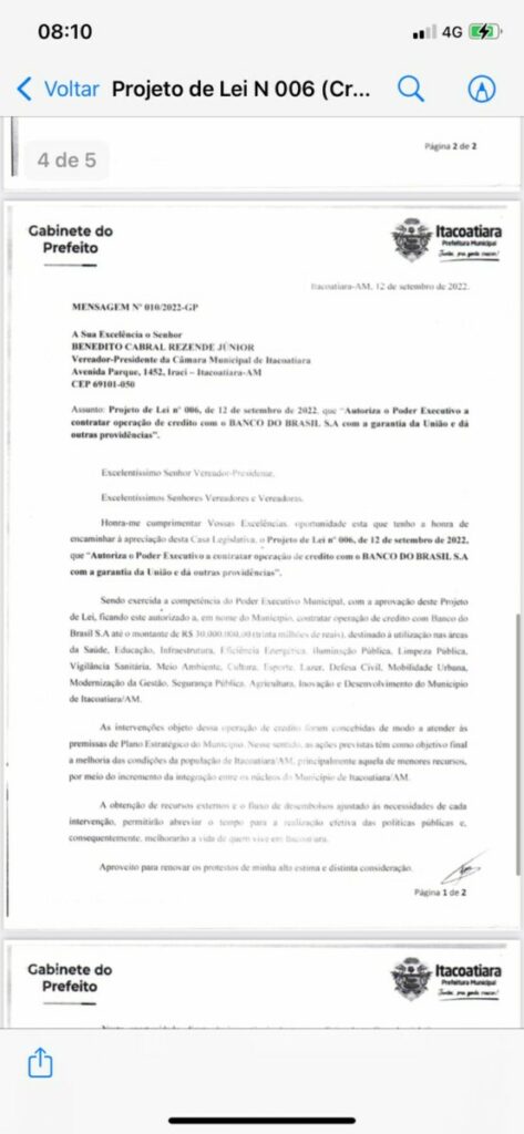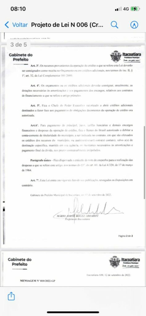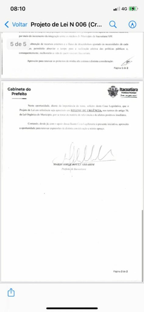 O empréstimo ainda foi solicitado pelo prefeito Mário Abrahim, em caráter de urgência e a justificativa usada por ele é a melhoria das “condições da população de Itacoatiara”.
