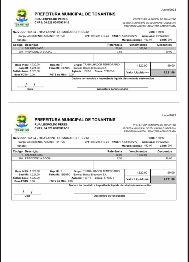 Ainda segundo a denúncia, o prefeito de Tonantins teria utilizado a verba federal em 2023, dos 70% destinado ao Fundo de Manutenção e Desenvolvimento da Educação Básica e de Valorização dos Profissionais da Educação (FUNDEB) para beneficiar Rhayanne, com a mesma nomenclatura e carga horária, mas na Secretaria Municipal de Educação.